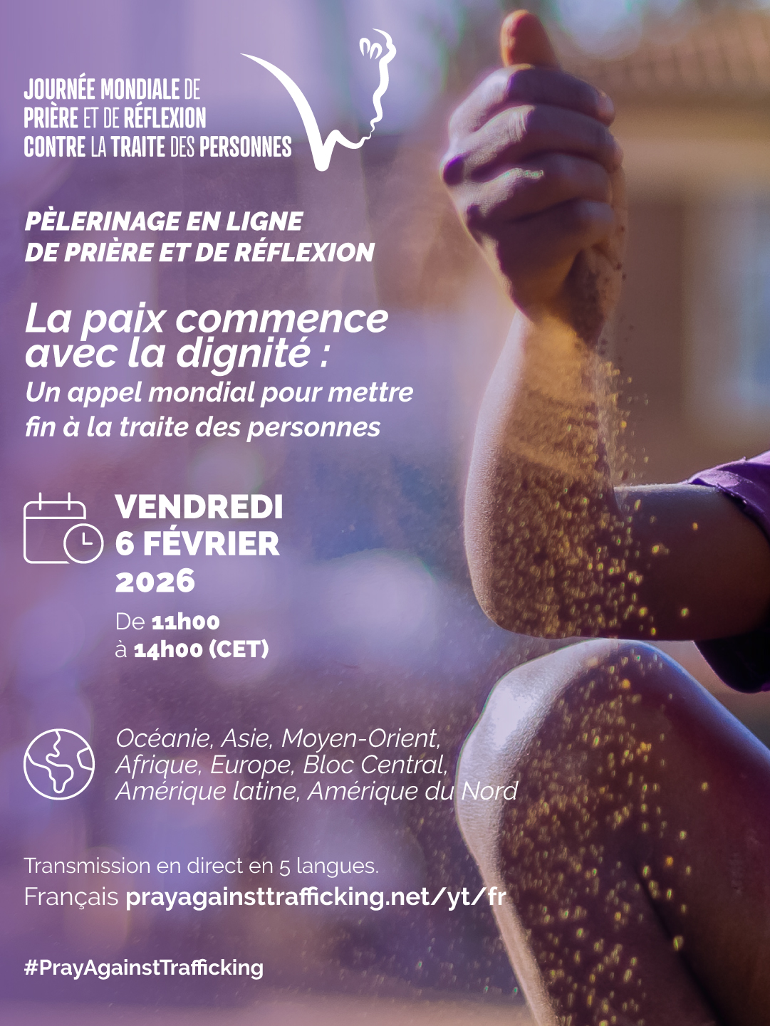 Diffusé en direct sur YouTube en cinq langues, voici les liens pour participer à la veillée en français sur www.prayagainsttrafficking.net/yt/fr